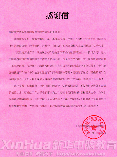 安徽新華電腦專修學院08屆學生李偉,在騰訊搜索推廣第一季度風云榜評比中以優異的業績榮獲“最佳銷售”稱號,發來感謝信以表達對新華為他們輸送優秀人才的感激之情。