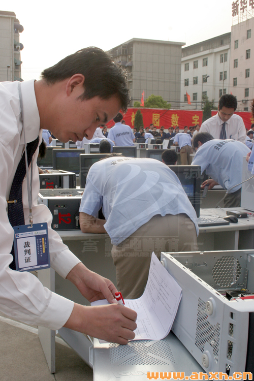 4月24日下午,安徽新華電腦專修學院西區操場陽光普照,70臺被布置了軟硬件故障的計算機,整齊的排列著,靜待各學區比賽中脫穎而出的選手們。聯想公司朱嶸總監、新華教育集團的相關領導們來到決賽現場,為選手們加油鼓勁。新華電腦專修學院副院長蘇凱鈞宣布決賽開始后,選手們立刻開始了認真的設備檢測,他們全神貫注的表情和操作嫻熟的雙手,引來了眾多新華學子的駐足觀看。