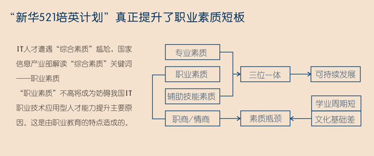 2006年6月,新華歷時(shí)五年的嘔心研究,在中國(guó)IT教育領(lǐng)域率先推出“新華521培英計(jì)劃”,正式把學(xué)生素質(zhì)拓展和職商教育納入教育體系,讓每一位學(xué)子都能通過(guò)在新華系統(tǒng)的學(xué)習(xí),成為始終保持新鮮狀態(tài),時(shí)刻擁有前進(jìn)意識(shí)和飽滿激情的人,新華根據(jù)企業(yè)的需求,歸納出一套系統(tǒng)的職場(chǎng)發(fā)展規(guī)劃,有助于學(xué)子運(yùn)用理智的思維能力分析、幫助自己明確行業(yè)動(dòng)態(tài)和職業(yè)目標(biāo),能夠持續(xù)不斷的進(jìn)步,成為企業(yè)歡迎的具有“開(kāi)拓、創(chuàng)新、務(wù)實(shí)”精神的職業(yè)人,滿足企業(yè)招聘人才、學(xué)子成功就業(yè)的雙需求!
