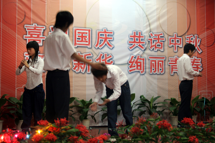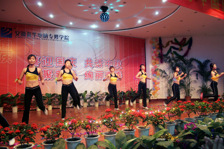 簡潔流暢的現代舞《海盜》,揭開了晚會的序幕;小品《招聘》滑稽搞笑;《青藏高原》帶著大家一起來到了那個神秘雪域;機械舞新穎別致;歌曲《童話》感人至深;笛子伴舞《夢里水鄉》笛聲悠揚,舞姿曼妙;黃梅戲《誰料黃榜中狀元》、《扮皇帝》,讓同學們體會了一把安徽地方戲曲的魅力;健美操表演韻律十足……豐富多彩的節目吸引了在場的每位同學,不時的響起雷鳴般的掌聲,當《新華的天空》響起時,所有同學紛紛起立,共同唱響這個屬于新華人自己的青春之歌。