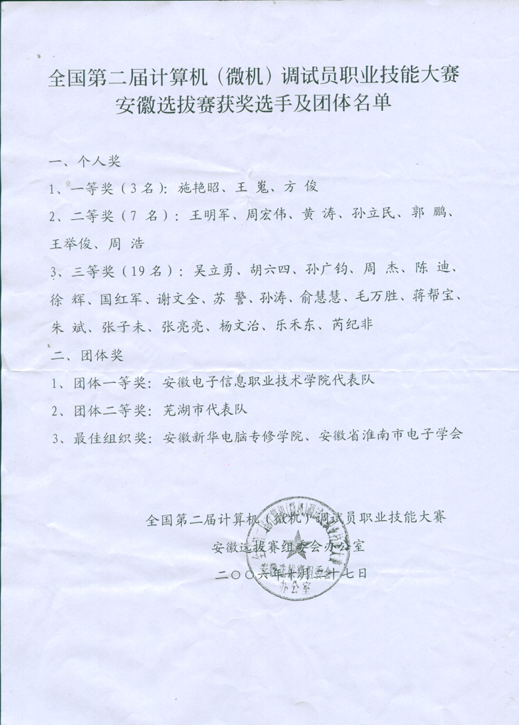 10月26上午,全國第二屆計算機(微機)調(diào)試員職業(yè)技能大賽安徽選拔賽頒獎大會在信息產(chǎn)業(yè)廳隆重舉行,安徽省信息產(chǎn)業(yè)廳副廳長吳曉明、安徽省勞動和社會保障廳助理巡視員劉光明、安徽省軟件行業(yè)協(xié)會理事長汪炳興、安徽省信息產(chǎn)業(yè)廳信息化推進處處長兼大賽裁判組組長尹鍵、安徽省電子產(chǎn)品監(jiān)督檢驗所所長兼大賽組委會委員王愛華、安徽新華電腦專修學院副院長楊東風等領(lǐng)導出席了本次頒獎大會。