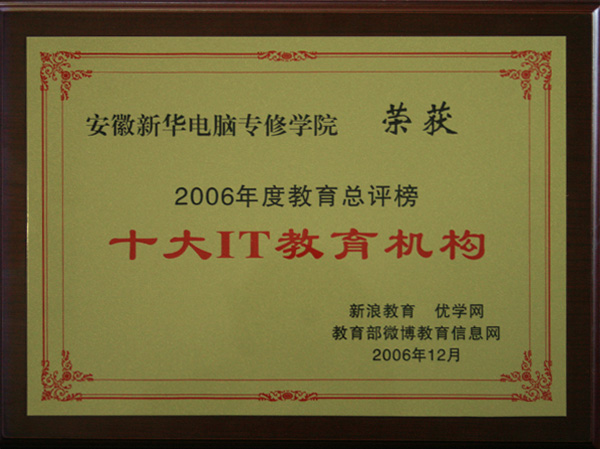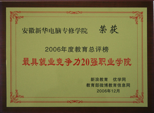 12月18日,由新浪網、教育部微博網、騰訊、優學網主辦,《中國青年報》、《中國教育報》、《新京報》等全國40多家知名新聞媒體支持的“百舸爭流,誰是英雄—2006年度教育總評榜活動”頒獎盛典隆重舉行,新華電腦專修學院以絕對優勢一舉摘得“十大IT教育機構”、“最具就業競爭力20強職業學院”兩項大獎,成為中國IT職業教育界唯一獲兩項殊榮的電腦教育機構,這也是新華獲得“2006十大影響中國IT教育機構”后的又一殊榮。