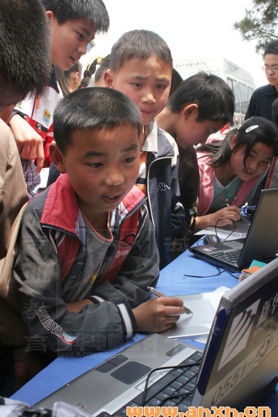 捐贈儀式結束后,新華電腦專修學院的老師向同學們展示了電腦繪圖、上網操作演示等功能演示,吸引了同學們的爭相圍觀,看到想像中的圖案能通過手寫板變成現實,七(2)班的陳同學說,看到用“筆”也能在電腦上畫畫,好興奮哦,以后我也要學好電腦。