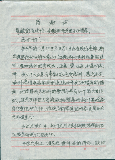 近日,新華電腦專修學(xué)院接收到來自鳳臺(tái)縣的一封感謝信。這封來自鳳臺(tái)縣的感謝信是鳳臺(tái)縣參加“第三屆安徽省部分縣中小學(xué)教師計(jì)算機(jī)培訓(xùn)班”的老師寫來的,字里行間流露出對(duì)省政協(xié)、新華電腦專修學(xué)院的感激之情。