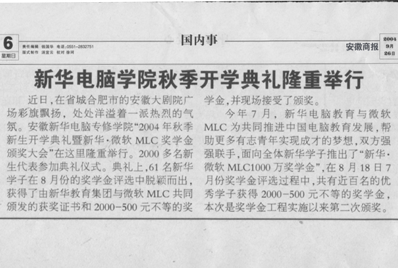 9月21日,位于省城合肥市的安徽大劇院廣場彩旗飄揚,處處洋溢著一派熱烈的氣氛。安徽新華電腦專修學院“2004年秋季新生開學典禮暨新華?微軟MLC獎學金頒獎大會”在這里隆重舉行。2000多名新生代表參加典禮儀式。
