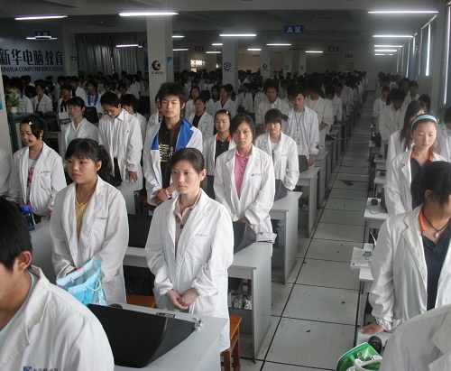 2008年5月19日14時28分,從北國林海到南疆漁村,從天山牧場到江南水鄉(xiāng),遼闊的中華大地,沉浸在無比悲痛之中。此時此刻,安徽新華電腦專修學(xué)院內(nèi),凄厲的警報聲響起,全體師生自覺的停下手頭的一切工作,肅立默哀三分鐘。