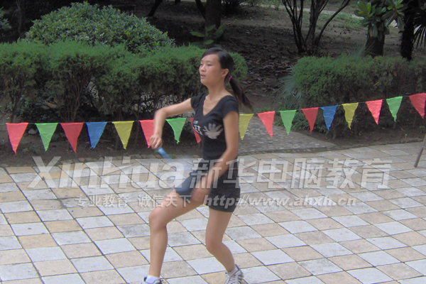 決賽開始前,比賽組織方的工作人員早早來到教學樓門口,用五色旗幟隔出兩個比賽場地。進入決賽的選手經(jīng)過抽簽確定自己的組次和對手,紛紛進行熱身準備。他們個個衣著簡單利索,運動味十足。特別是位女選手,以短袖熱褲上場,活力四射、讓人眼前一亮!