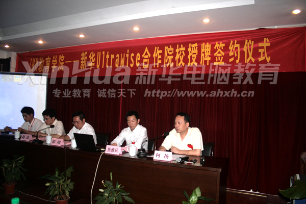 Ultrawise公司副總經理焦雅兵與安徽新華電腦專修學院院長張明共同簽署、交換了《校企共建“IBM教育學院-新華Ultrawise合作院!眳f議書》并揭牌,此舉標志著新華電腦教育領域向國際化、專業化方面的又一次重大突破。