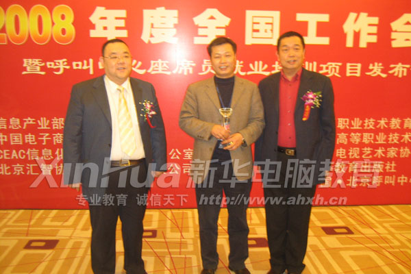 2008年12月27日,“國家信息化計算機教育認證(CEAC)2008年度工作會議”在北京九華山莊隆重召開。作為中國IT教育界的盛會,大會受到了工業和信息化部(原信息產業部)推進司、中國電子商務協會、中國職業技術教育協會、中國職工教育和職業培訓協會、中國高等教育研究會的高度關注。工業和信息化部推進司洪京一副司長、國家職工教育和職業培訓協會畢結禮秘書長、中國電子商務協會孟玉副秘書長、中國職業技術教育協會、人民郵電出版社等領導列席了大會。新華教育集團陳映年經理、安徽新華電腦專修學院考試中心金鮑主管應邀參加了此次年度會議。在此次會議上,新華教育集團榮獲“精誠合作獎獲”,同時榮獲 “CEAC國家信息化教育示范培訓基地”榮譽稱號,這也是新華連續六年獲此殊榮,全國幾十家新聞媒體對該會進行了全程報道。