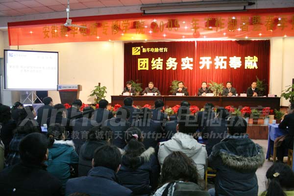 2008年,是安徽新華電腦專修學院發展進程中不平凡的一年,是學院繼往開來、總結探索、開拓創新的一年。安徽新華電腦專修學院院長張明對過去一年所取得的成績和存在的問題作了簡要的總結,然后就目前的教育現狀和形勢作了詳細的報告。他強調,要堅持教學創新,堅持“以學生為本”的理念,全面推進人才強院戰略;堅持“從嚴治校”的方針,不斷提高管理的水平和效能,以構建和諧學院為目標,以實施品牌戰略為主線,力推學院各項工作再上新臺階。并指出,各部門在今后要提高執行力,抓好落實,形成統一認識、統一步調,順利高效地完成各項工作。同時,各部門要按照職能分工和學院安排,各負其責、有條不紊地逐項落實工作,確保教學及其他各項工作順利進行。