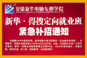 為緩解2009年就業形勢,新華電腦專修學院推出“定向就業系列班”。首期新華·得搜定向就業班已與3月28日正式開班。日前,應得搜公司及廣大求學者要求,新華·得搜定向就業班緊急補招20名, 4月28日報名截止,名額有限,報名從速。