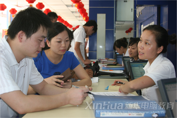 時值開學時節,新華電腦專修學院咨詢報名中心內人頭攢動,匯集來自全國各地的IT愛好者。圖為學子正在接受職業規劃師指導