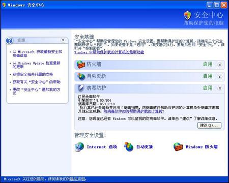 當然在這其中還是以“木馬病毒”最令人頭痛,而在XP SP2中自帶的安全總管便可以幫您解決這一難題。由于大多數用戶不知道自己的系統是否處于安全狀態,這給病毒或黑客的入侵留下了可乘之機。Windows 安全中心能夠監視系統安全組件是否正常工作,通過它可以在最短的時間內識別出Windows防火墻、自動更新、防病毒軟是否已經正常工作。