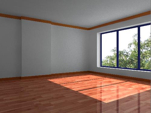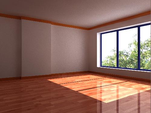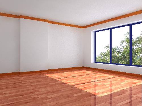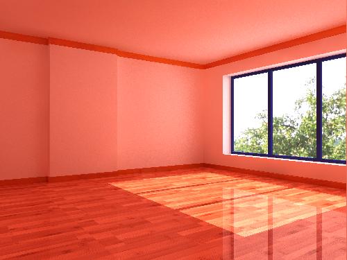 如圖1-1所示,場景中地板屬于一種面積比較大的紅色實木地板材質,由于它的色彩飽和度比較高,因此在光子反彈的過程中光子攜帶著地板的紅色顏色信息轟擊著其它正常的材質表面如白色的墻面,最終造成了白色墻體變紅的材質溢色效果,這是不合理的。