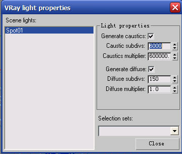 (3)提高光子強度的方法有三種,我們既可以在光源或對象上右擊,在彈出的VRay屬性面板中提高Multiplier倍增值,也可以直接在全局面板中增加Multiplier,本次練習中我們在燈光屬性上做文章,因為在燈光屬性中不但可以增加焦散光子倍增值,還可以提高焦散的品質,也就是說大幅提高Caustics subdivs(焦散細分值),這部分的最終參數設置如圖6-9所示。