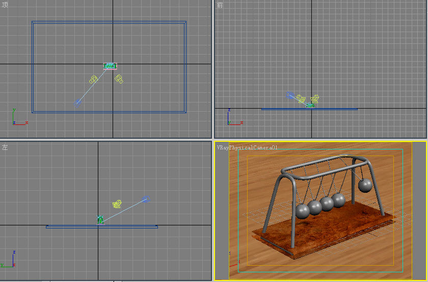 打開我們設定好的一個場景,這是一個金屬撞球的場景,我們對小球做了簡單的一段動畫,架好了VRay的物理相機,布置好了燈光,場景如圖所示5-1所示。
