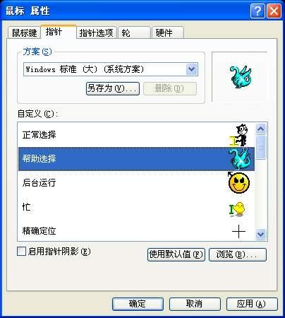 再依次單擊“開始→設置→控制面板”,雙擊“鼠標”打開“鼠標屬性”,從“指針”選項卡中點“瀏覽”按鈕(圖2),定位到上述文件夾中的鼠標指針文件并“確定”,就可擁有漂亮的鼠標指針啦。
