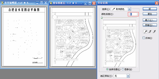 四、通過“選擇”——“色彩范圍”命令,分別將“整體圖框層.TIF”和“文字說明層.TIF”的白色空白部分吸取得到選區(注:色彩范圍的顏色容差設置為“0”,以免誤選擇到圖框部分。),并按“Delete”刪除。具體參數和結果如圖04~圖05所示。