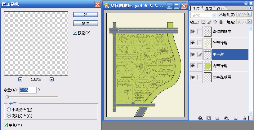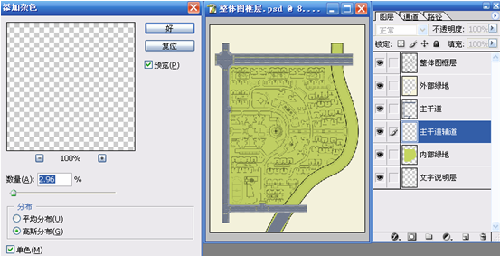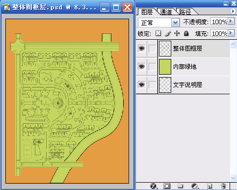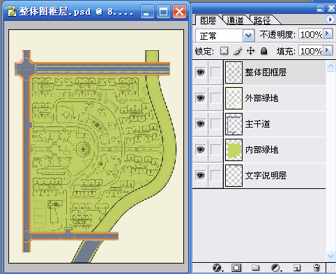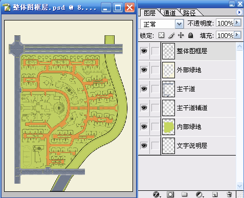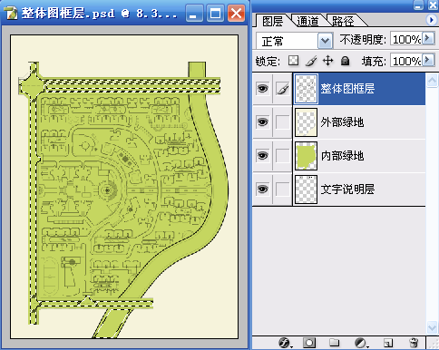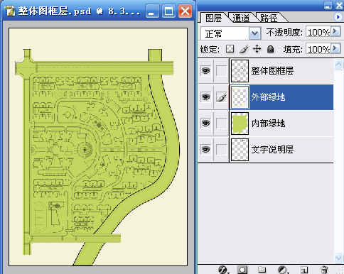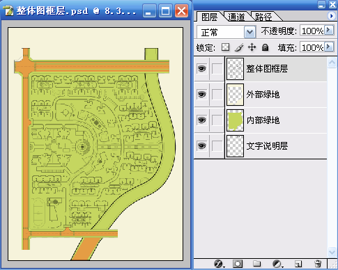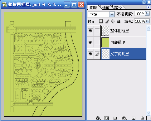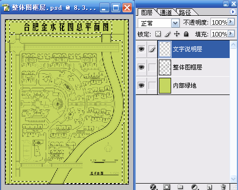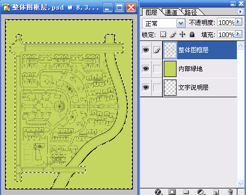 五、使用移動工具(V)將“文字說明層”移動到“整體圖框層”的畫布上來,新建圖層命名為“內部綠地”層,并填充前景色(R:197 G:214 B:96)。結果如圖06所示。