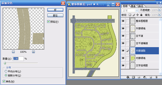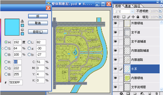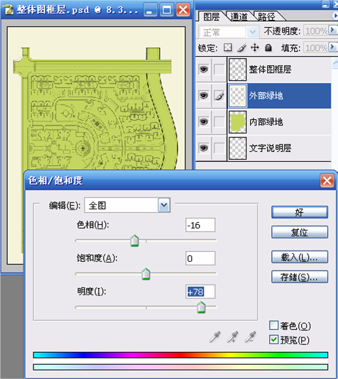 七、使用魔棒工具(W)在“整體圖框層”選擇主干道以外的區域,再利用快速蒙版(Q)的臨時用紅色著色功能進行檢查,檢查無誤后再次按(Q)鍵退出快速蒙版,選擇“內部綠地”層使用 “通過剪切的圖層”命令(Ctrl+Shift+J)得到新圖層,并命名為“外部綠地”。使用“色相/飽和度”命令(Ctrl+U)對“外部綠地”層進行色彩和明度的調整以便于和“內部綠地”層進行區分。具體參數和結果如圖10~圖13所示。