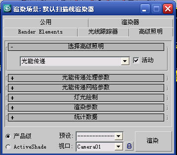 按下鍵盤上的F10鍵,打開“渲染場景:默認掃描線渲染器”對話框,切換至“高級照明”選項卡,在照明插件中選擇“光能傳遞”,顯示界面如圖14-3所示。