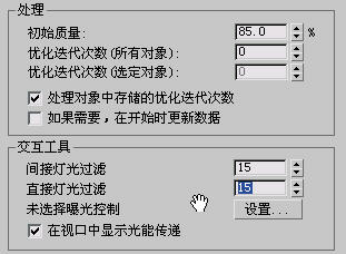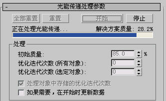 A.展開“光能傳遞處理參數”卷展欄,設置初始質量為85%,這個求解品質就可以理解為最終全局光照效果的精細程度。值越高,則光子反彈就越充分,場景的光線分布就越接近于真實的自然光反彈分布。但值得用戶注意的是,它的品質與場景中的光照亮度無關。如果是你的燈光亮度不夠,僅靠提高求解品質是不行的,必須更改燈光的光照強度并重新光傳方可解決,這一點請大家務必注意。