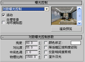單擊“設置”按鈕,此時會彈出“環境和效果”面板。在曝光控制方案中選擇對數曝光,這種曝光方式與光能傳遞之間配合的較好。設置好后,在右側的“渲染預覽”小窗口中會出現一個簡單的示意圖,方便用戶調節下面的曝光參數,默認曝光效果如圖14-8所示。