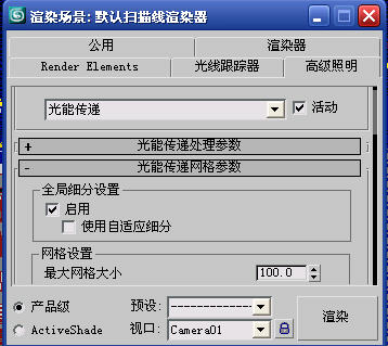 (1)首先,我們將以前的光能傳遞效果進(jìn)行重置,這一步比較簡單我就不細(xì)說了。重置之后場景又恢復(fù)到?jīng)]有光能反彈分布的原始階段,但我們必須設(shè)置全局網(wǎng)格細(xì)分,將最大網(wǎng)格大小設(shè)置為100,參數(shù)設(shè)置如圖16-1所示。