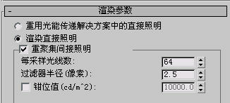 (3)展開“渲染參數(shù)”面板,勾選“重聚集間接照明”選項,其它所有參數(shù)暫時保持默認(rèn),參數(shù)設(shè)置如圖16-3所示。