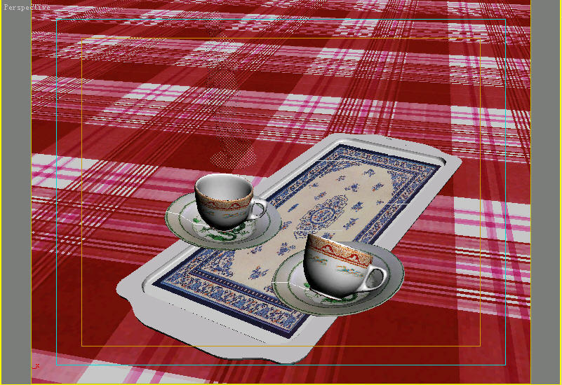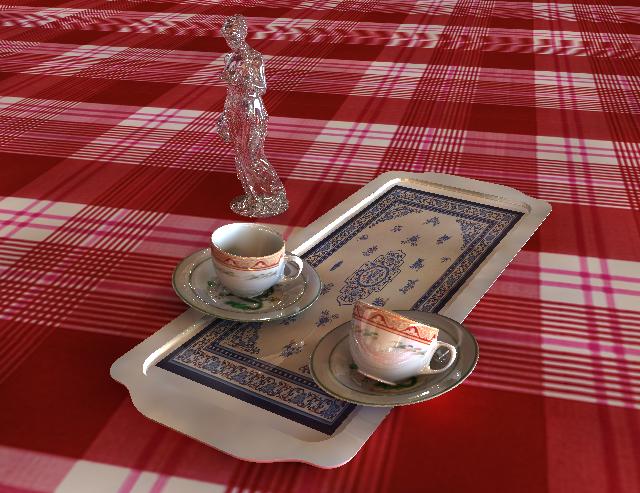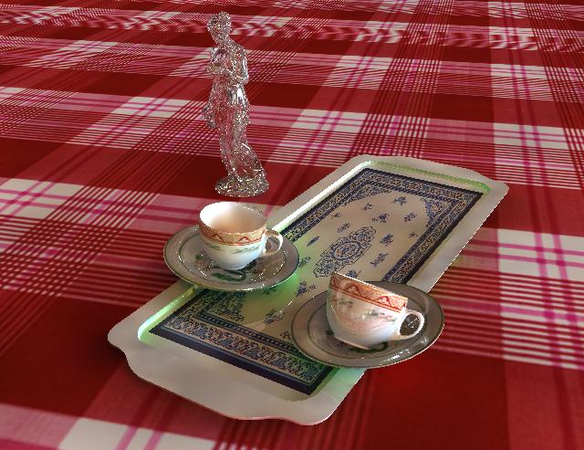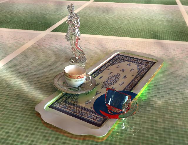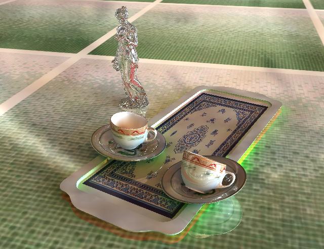 將Refract mtl設(shè)置為一種深藍(lán)色,為了觀察折射效果,將其中的一個(gè)茶杯和盤子統(tǒng)一設(shè)置為一個(gè)清玻璃效果,然后再次進(jìn)行測(cè)試渲染,結(jié)果如圖24-6所示。