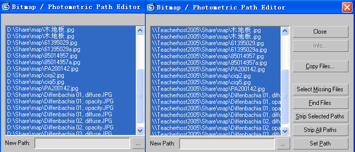 接著單擊“編輯資源”按鈕,在彈出的“位圖/光度學(xué)路徑編輯器”中選擇所有的貼圖文件,單擊“新建路徑”按鈕右側(cè)的省略號(hào)小按鈕,在彈出的“選擇新路徑”面板中設(shè)定貼圖文件新路徑為從網(wǎng)上鄰居中調(diào)用的共享文件夾Share中的“貼圖”文件夾,然后單擊“使用路徑”即可,圖中左側(cè)為原始的本地路徑,右側(cè)為必須更改為的網(wǎng)絡(luò)路徑。
