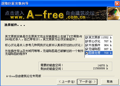 雙擊安裝圖標,進入Lightscape的安裝界面,你只需不停的點“下一步”即可,在這個頁面下你最好勾選“外掛插件”、“無縫貼圖”和“圖像處理”等外掛組件,其中Dos渲染需要用到的是外掛插件,頁面如圖17-2所示。