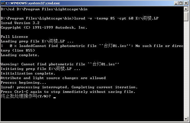 A: 以上設置完成之后,單擊“執行”按鈕,系統會打開一個MS-DOS窗口開始執行,如果在某個時候用戶需要取消渲染過程,可以按一下Ctrl+C組合鍵來終止操作過程,根據需要選擇yes or no,如圖17-8所示。