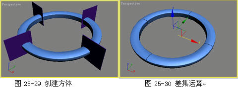 (11)為了將播放鍵中的4個(gè)按鍵分別獨(dú)立出來(lái),需要使用“Boolean”命令進(jìn)行求解。在頂視圖中創(chuàng)建一個(gè)“長(zhǎng)度”為30,“寬度”為0.4,“高度”為30的長(zhǎng)方體,再以播放鍵模型的中心為軸心旋轉(zhuǎn)復(fù)制3個(gè),如圖25-29所示。將其中的一個(gè)與其它三個(gè)結(jié)合為一個(gè)整體,方便以后的布爾運(yùn)算。用播放鍵模型一次性減掉立方體模型,最終效果如圖25-30所示。