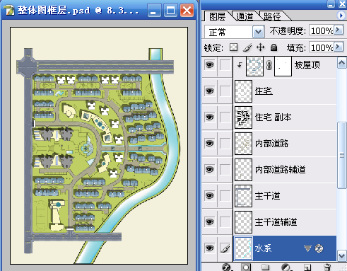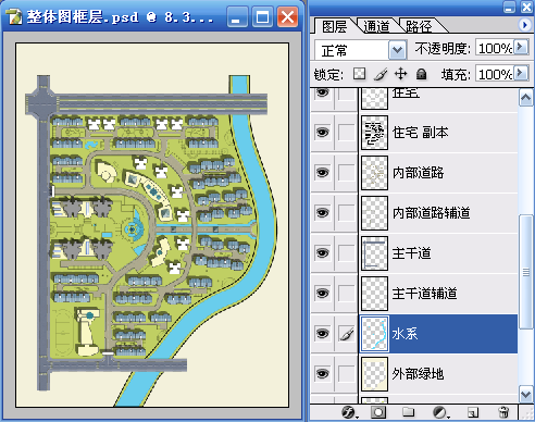 水系的處理我們在前面整體大環(huán)境的處理過程中已經(jīng)簡單的填了藍(lán)色。這樣的效果實在是差強(qiáng)人意,所以我們要對其的細(xì)節(jié)做更多更細(xì)致的處理。