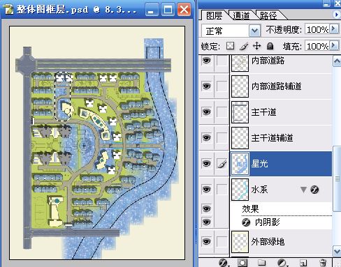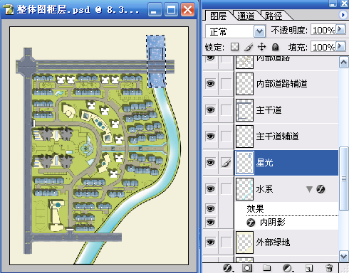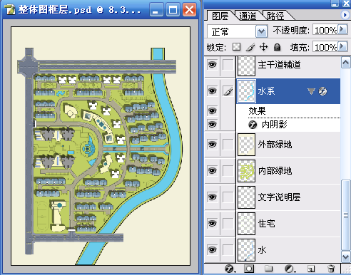 一、選擇“水系”層添加內(nèi)陰影的圖層樣式。具體參數(shù)和結(jié)果如圖01~圖03所示。
