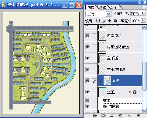三、明暗關(guān)系涂抹出來后質(zhì)感還不夠,我們找一張如下圖的“星光”素材來增加水系的質(zhì)感。將“星光”素材移動到“水系”層上命名為“星光”層,在有選區(qū)的狀態(tài)下使用移動工具對其復(fù)制,使其覆蓋滿“水系”的部分,然后向下編組(Ctrl+G)并將“星光”層的不透明度降至50%。具體參數(shù)和結(jié)果如圖05~圖08所示。