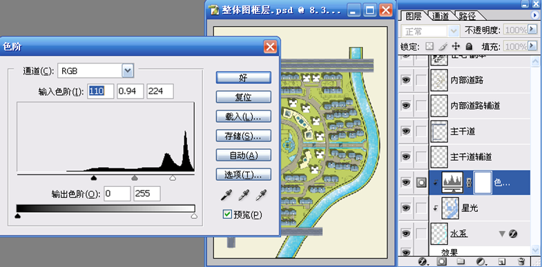四、通過“圖層”——“新調(diào)整圖層”——“色階”命令和“圖層”——“新調(diào)整圖層”——“色相\飽和度”命令給“水系”層添加“色階”和“色相\飽和度”的調(diào)整層并向下編組(Ctrl+G),對“水系”的效果做更細(xì)致的調(diào)整。具體參數(shù)和結(jié)果如圖09~圖10所示。