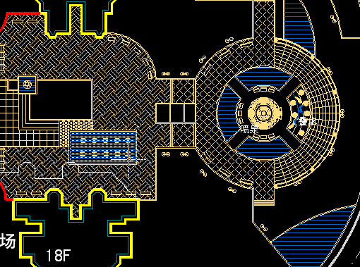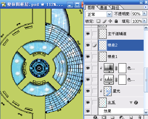 五、我們在圖紙上看到中央水景的部分還有噴泉的部分,我們使用噴泉的素材將畫面豐富起來,使用移動工具(V)對其復(fù)制和位置的調(diào)整,再使用自由變換工具(Ctrl+T)對素材的大小進(jìn)行縮放。具體參數(shù)和結(jié)果如圖11~圖14所示。