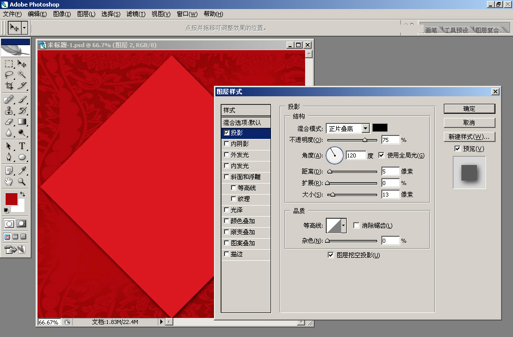 2. 新建圖層,用矩形選框工具M按SHIFT鍵繪制正方形,CTRL+T變換選區旋轉45度,填充R:219,G:24.B:32亮一點的紅色。添加圖層樣式:設置投影如圖1-2