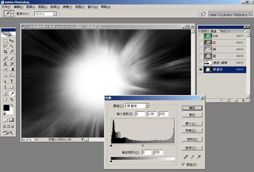 2、Ctrl + J把背景圖層復(fù)制一層,隱藏副本2,選擇通道面板,選藍(lán)色通道復(fù)制,Ctrl + L色階調(diào)整。如圖1-2