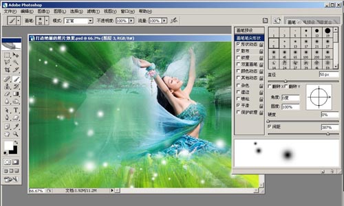5.新建圖層,設(shè)置前景色為白色,選擇畫筆B,設(shè)置硬度0,間距387,散布100%,兩軸勾選,大小攔動(dòng)100%。如圖1-5