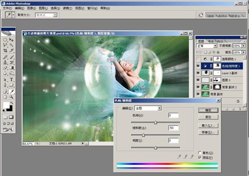 9、添加調(diào)整圖層——色相飽和度。飽和度:-50,編輯調(diào)整層蒙版將不需要的部分隱藏。如圖1-9