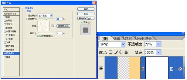4)將素材2定義成圖案,(編輯/定義圖案),使用圖層樣式/圖案疊加命令,并使用透明度,如圖所示: