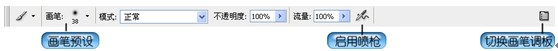 畫筆工具的選項欄如圖所示。利用畫筆工具的選項欄可以設置畫筆的形態、大小、不透明度以及繪畫模式等特性。