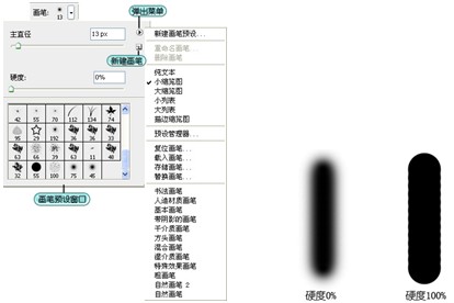 4) 彈出菜單:單擊 按鈕彈出下拉式菜單,用于改變畫筆預設的顯示方法、刪除畫筆、創建新畫筆、改變畫筆的名稱,還可以調用Photoshop CS3提供的其他畫筆預設,或是載入用戶由其他途徑獲得的畫筆預設。