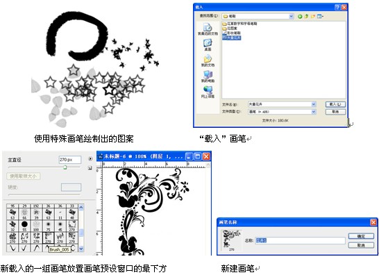 執行“載入畫筆”命令后,彈出“載入”對話框,在其中選擇畫筆文件,確定對話框后,新增的一組筆畫將放置在畫筆預設窗口的最下端。