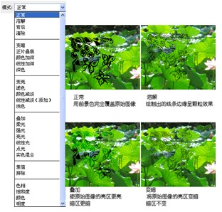 在“模式”下拉列表中設置畫筆工具的繪畫模式,不同的繪畫模式將產生不同的繪制結果,如圖所示。
