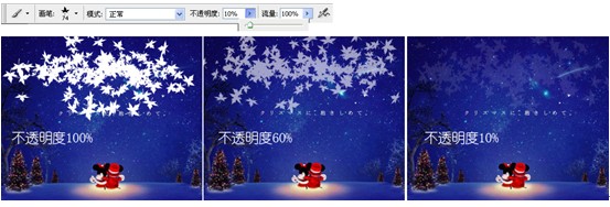 用于設置畫筆工具所繪顏色的不透明度(取值范圍為1%~100%),值為100%時直接繪制前景色,數值越低,前景色透明程度越強,1%時完全透明,如圖所示。單擊參數右側的三角形按鈕將彈出控制滑塊,拖動滑塊可根據需要設置不透明度,也可以直接在文本框中輸入數值。