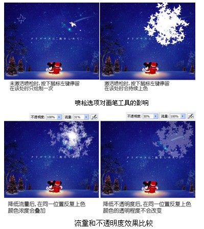 激活選項欄的 (噴槍)按鈕后,使用畫筆工具繪畫時,如果在繪畫過程中將鼠標按下后停頓在某處,噴槍中的顏料會源源不斷地噴射出來,停頓的時間越長,該位置的顏色越深,所占的面積也越大,如圖所示。流量決定了噴槍繪畫時顏色的濃度,當值為100%時直接繪制前景色,該值越小,顏色越淡,但如果在同一位置反復上色則顏色濃度會產生疊加效果,如圖所示。